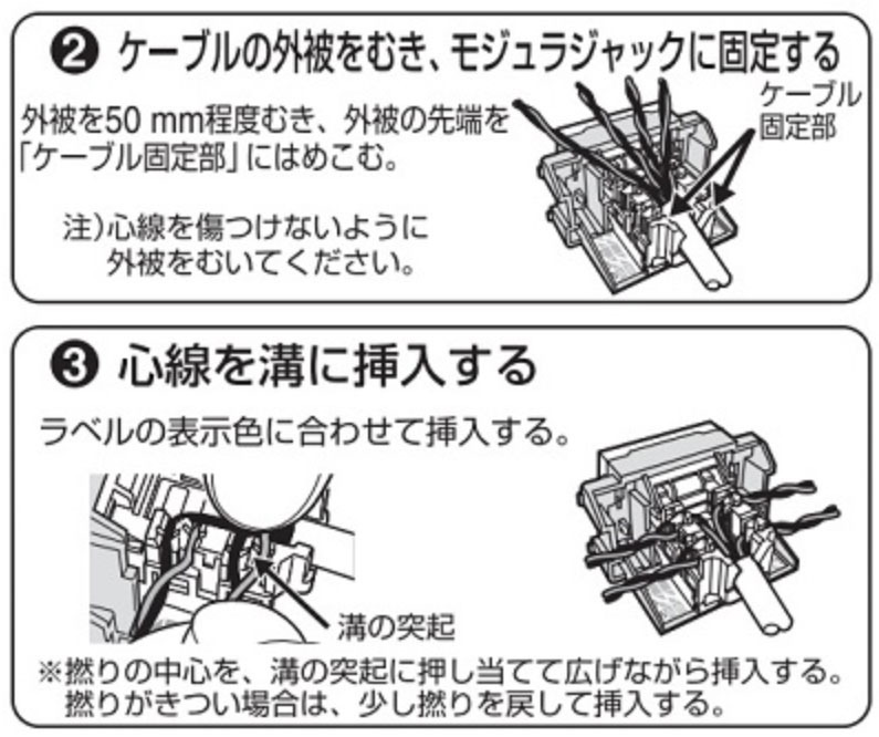 モジュラージャックの端子は、本来は8本のケーブルを溝に押し込めばそれで接続ができるのですが、細いケーブルではスカスカでした。やむなくそれぞれの端をむき出しにして半田をつけて太くして溝に押し込んだのです。
