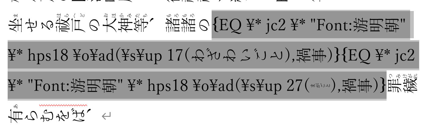 {EQ Y* jc2\* "Font:游明朝”\* hps18 \o\ad(\s\up 17 (わざわいごと),禍事)}