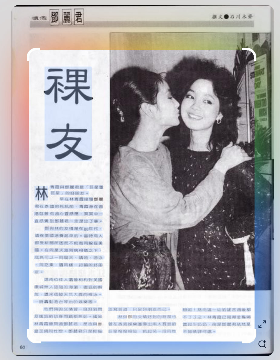 二人の友情は非常に深く、お互いに個人的な質問をすることにも躊躇しませんでした。かつてリン・ブリジットがテレサ・テンに、ケ小平との関係や自身の同性愛について尋ねたことが知られています。テレサ・テンはただの親友だと答えました。