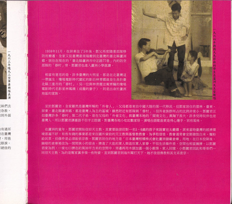 テレサ・テンの場合、彼女の家族は台湾で言うところの「大陸人」――両親は中国大陸からの第一世代移民――でしたが、彼女が住んでいた雲林、台東、屏東、台北県蘆洲郷は、主に台湾人が住んでいました。近隣には軍隊や「眷村」がありましたが、大陸人の割合は非常に少なかったのです。これらの村の多くの第二世代の子供たちと同様に、テレサ・テンは両親の「大陸文化」と台湾のローカルな「福建文化」の両方に浸って育ちました。幼少期の遊び友達の多くも台湾人でした。そのため、テレサ・テンは流暢な台湾語を話すだけでなく、台湾各地の台湾のお菓子も覚えており、台湾の歌を流暢に、そして独特の魅力をもって歌いました。